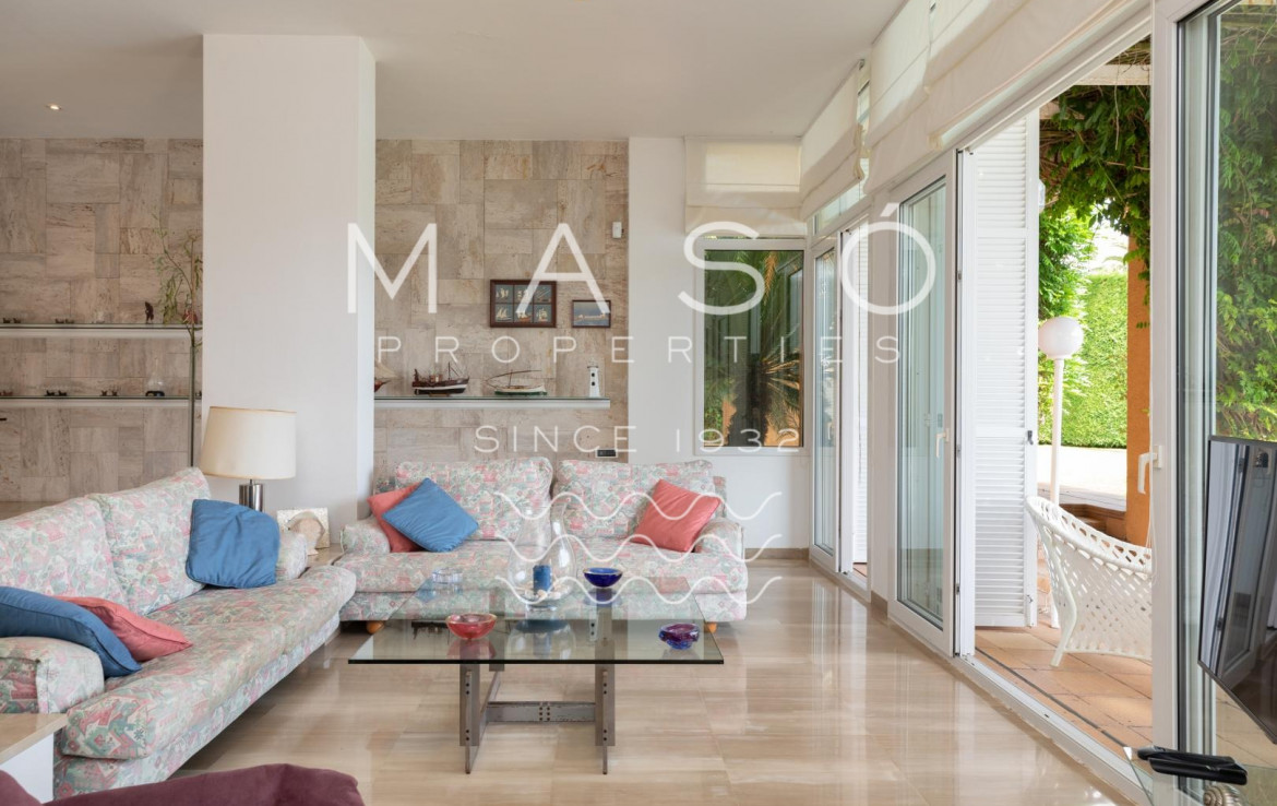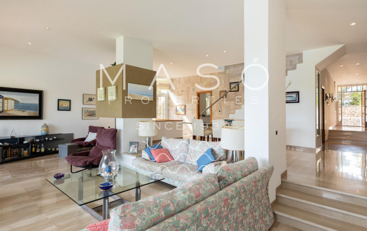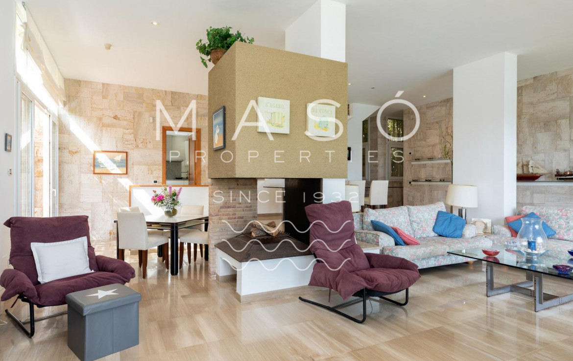 Esta casa en s' Agaro Vell de alto standing ofrece más de 500 m2 construidos sobre una parcela que supera los 1.200 m2 de superficie. El espacio es, por tanto, una de las señas de identidad de la propiedad de lujo, que disfruta, gracias a su ubicación, de una notable iluminación natural. Es precisamente la luz del sol la que dota de mayor calidez a las numerosa s estancias de la vivienda, que de este modo se vuelve mucho más acogedora. A tal efecto contribuyen de manera decisiva los suelos radiantes de mármol y la vistosa chimenea de la planta principal.