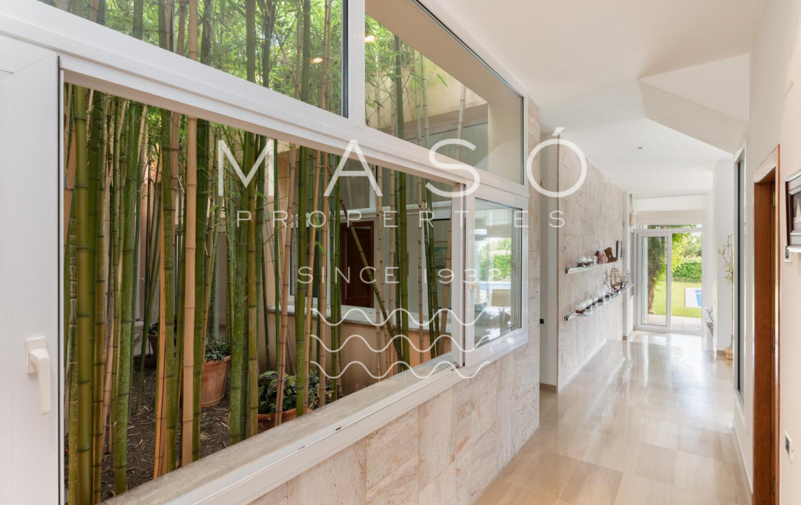 Esta grata sensación se consigue gracias a la disposición horizontal de la casa en La Gavina, con una sucesión de cristaleras en la sección lateral interior de la propiedad. Esta estructura se traduce igualmente en que algunas de las estancias principales, como el salón comedor, disfruten de buenas vistas a la piscina y el jardín. Esto se consigue gracias a la ligera elevación del comedor propiamente dicho, lo cual redunda en una panorámica más amplia de toda la parcela.